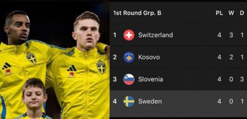 4轮比赛结束后,瑞典队一场没赢,只拿到1个积分,小组垫底,落后第1名瑞士9分,落后第2名科索沃6分,落后第3名斯洛文尼亚2分。目前,瑞典已经确定无缘小组第1,无法直接晋级世界杯。