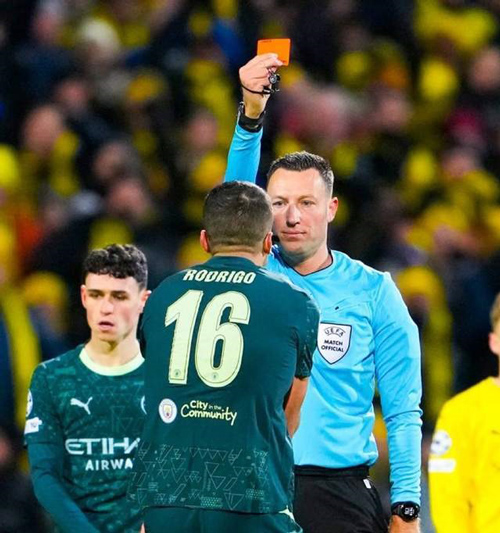 然而第62分钟,罗德里战术犯规拉拽对手,短时间连吃两张黄牌,堂堂金球先生被罚下,曼城剩下10人作战。