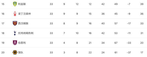 剩余1个降级席位,将在4队之中产生。第15名(利兹联)、第16名(森林)、第17名(西汉姆)之间各差3分,这三队的保级形势较为乐观。