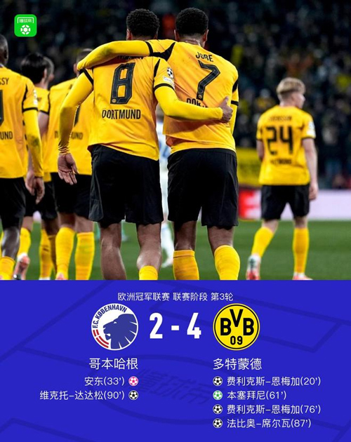 北京时间10月22日欧洲冠军联赛 联赛阶段 第3轮,哥本哈根对阵多特蒙德。哥本哈根维克托-达达松破门。多特蒙德费利克斯-恩梅加梅开二度,法比奥-席尔瓦破门,本塞拜尼破门,安东自摆乌龙。最终比分哥本哈根 2-4 多特蒙德。