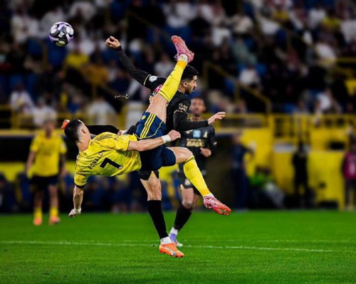 补时第6分钟,沉寂全场的C罗终于爆发,读秒阶段他接到队友的传中后,腾空而起凌空倒钩完成破门,帮助利雅得胜利锁定胜局。