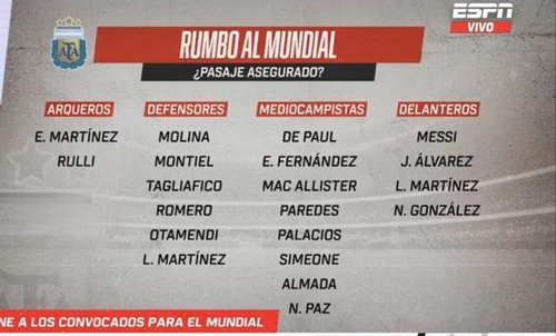 北京时间3月26日,来自ESPN阿根廷版的报道,尽管距离世界杯开幕还有78天,但阿根廷世界杯26人参赛名单已经基本确定。据悉,斯卡洛尼已经提前锁定了20名球员参加世界杯,只剩下最后6个名额,将由16名球员展开激烈争夺。