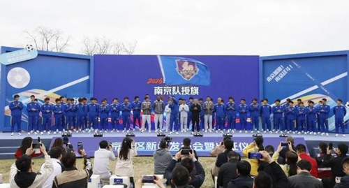 出征仪式现场,当队旗交到南京队队长手中,象征着拼搏与胜利的队旗迎风舒展,队歌《金陵战歌》响起,现场身着蓝色队服的球迷一同应和,形成一片蓝色的海洋,呐喊声与歌声交织,成为动人的出征旋律。